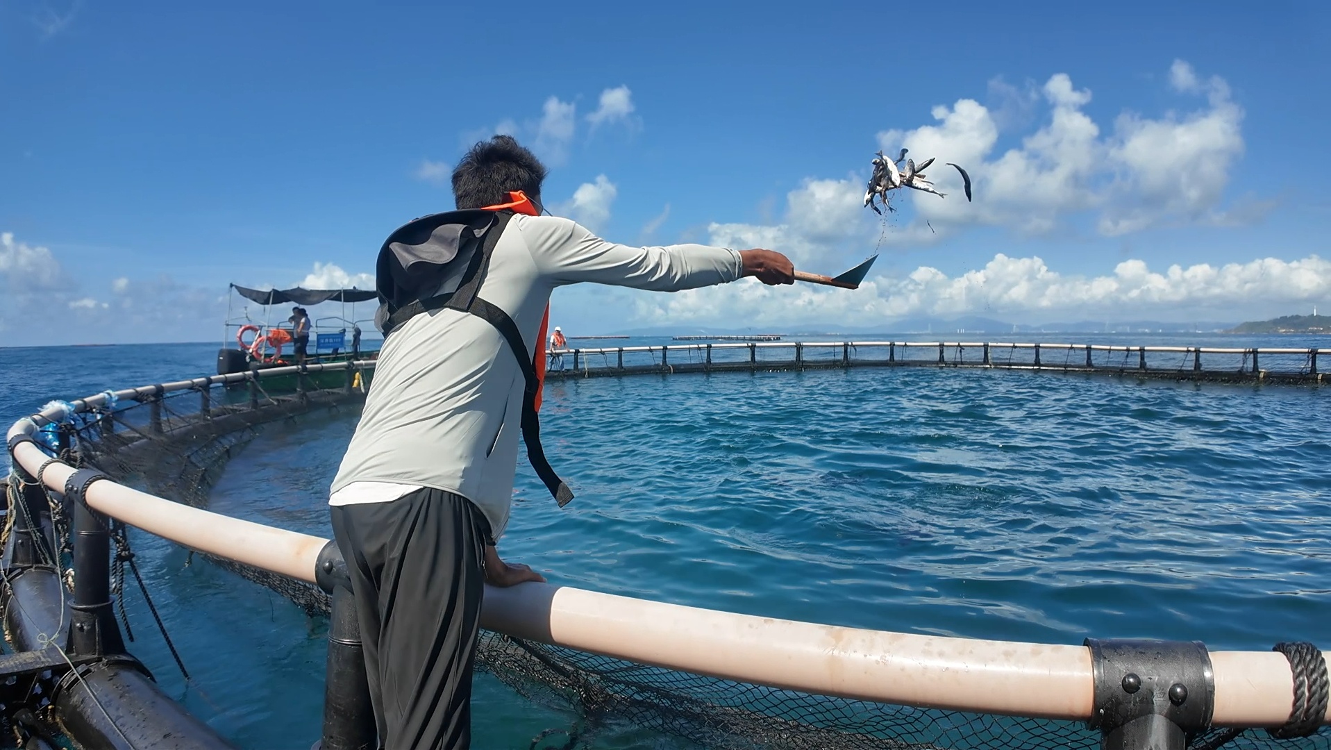 工作人员给黄鳍金枪鱼喂食(央广网记者 蔡文娟 摄)