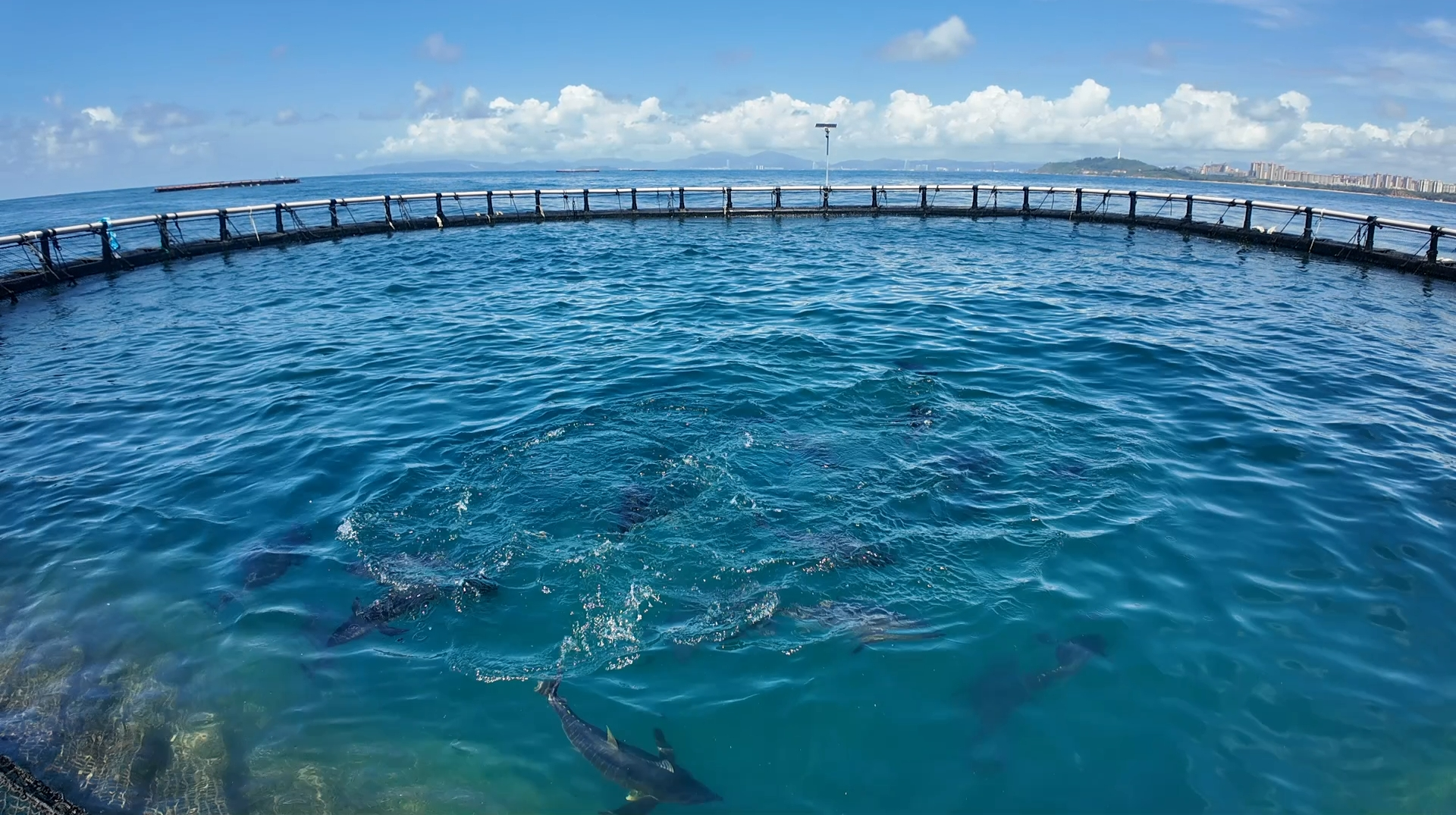 海面上,4个周长为90米、深7米的重力式圆形深海网箱里,黄鳍金枪鱼正充满活力地快速游动。历经30多个月精心培育,部分黄鳍金枪鱼的部分个体已超过50公斤,体长超1米,达到了上市的标准。